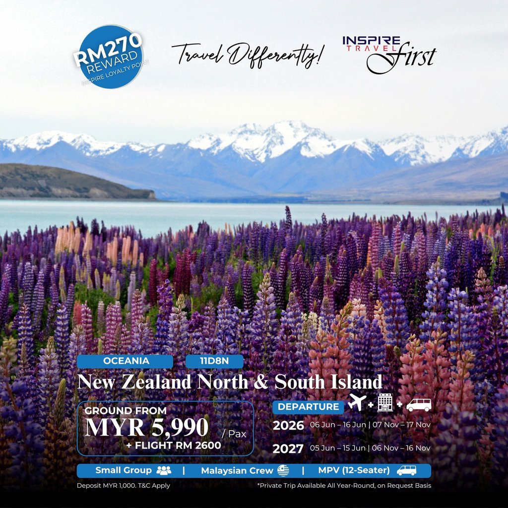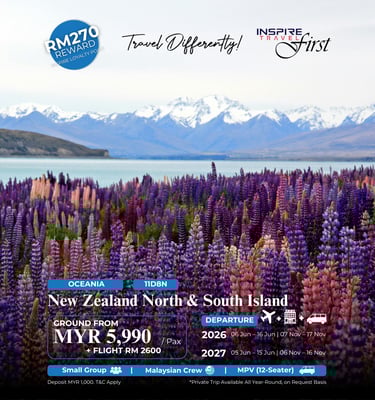 Perjalanan ke New Zealand North & South bersama Inspire Travel benar-benar pengalaman yang tak dapat dilupakan. Semua destinasi yang dibawa sangat memukau. Itinerari sangat well-planned dan fleksibel. Tour leader pun sangat friendly dan banyak membantu. Terima kasih kerana jadikan trip kami begitu lancar, selesa dan penuh kenangan indah.