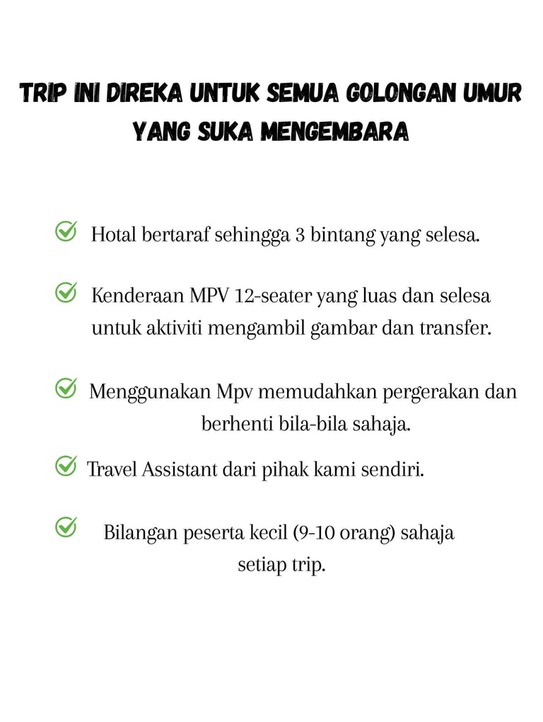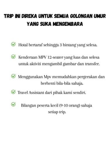 Kumpulan kecil, perjalanan selesa dengan MPV, Private & Customized, serta Pakej Perjalanan yang disesuaikan untuk setiap pengembara.