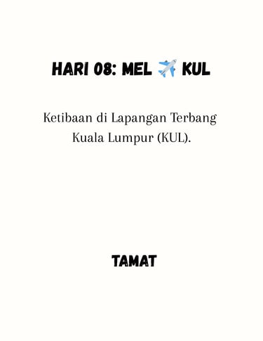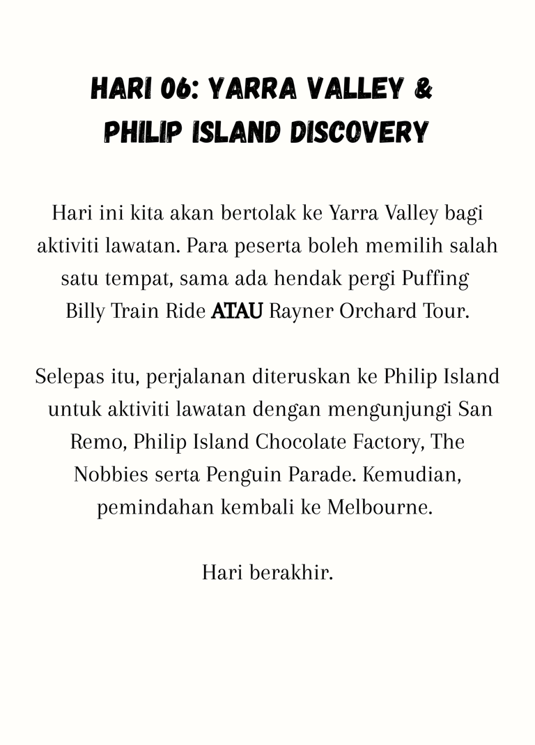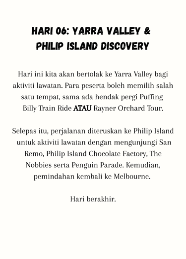 Kami sekeluarga sangat berpuas hati dengan trip Melbourne & Tasmania ini. Jadual perjalanan tidak terlalu rushing, sesuai untuk kanak-kanak dan warga emas. Insya-Allah akan repeat trip lagi.
