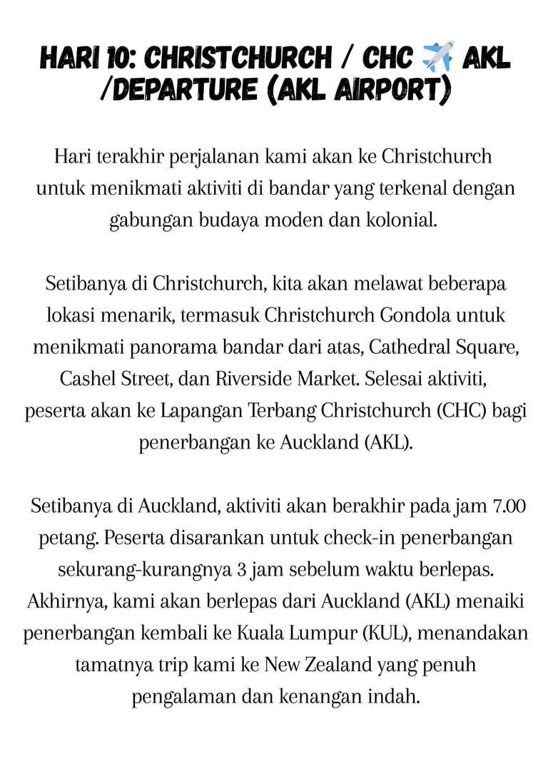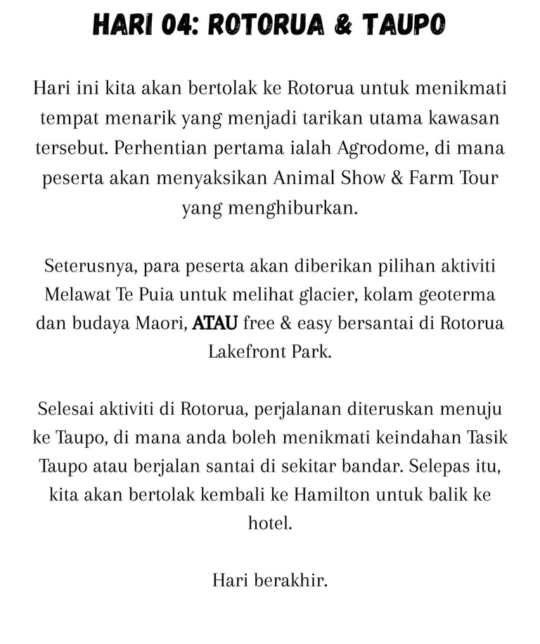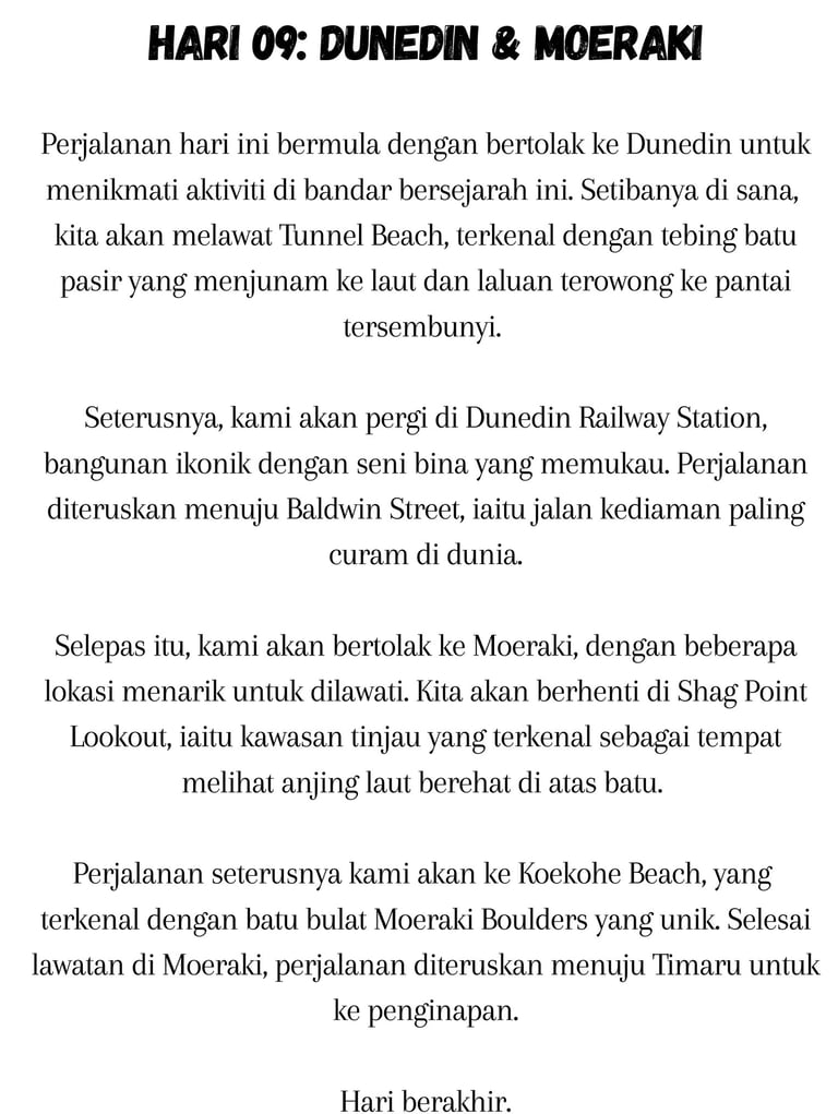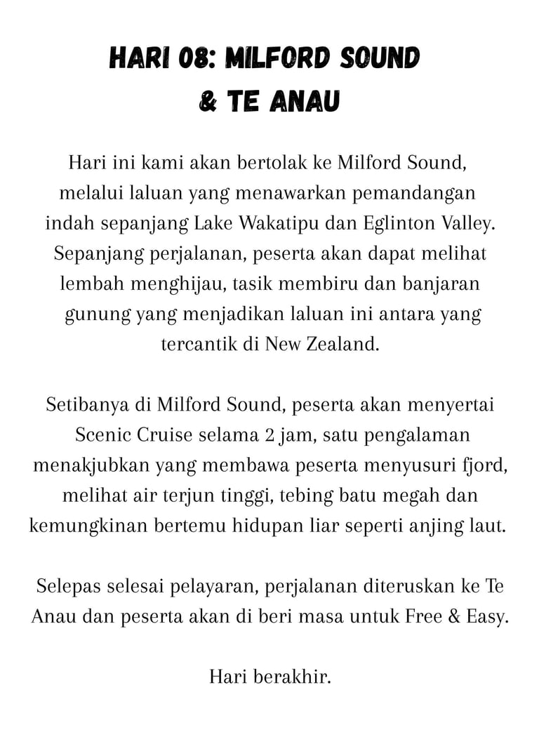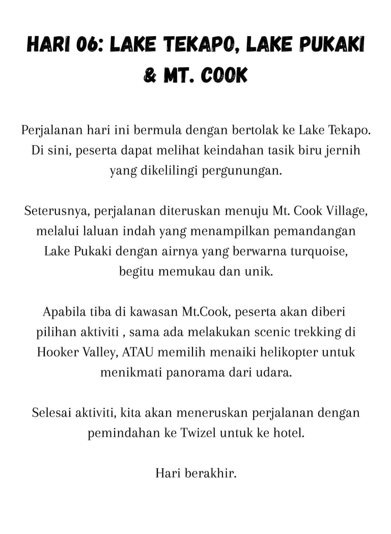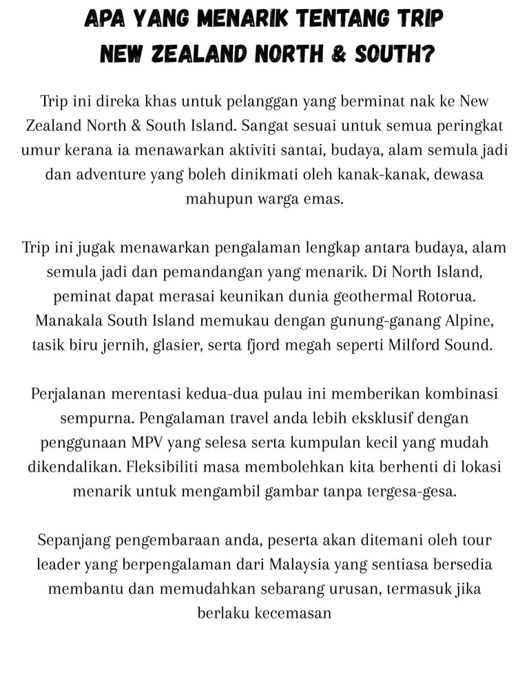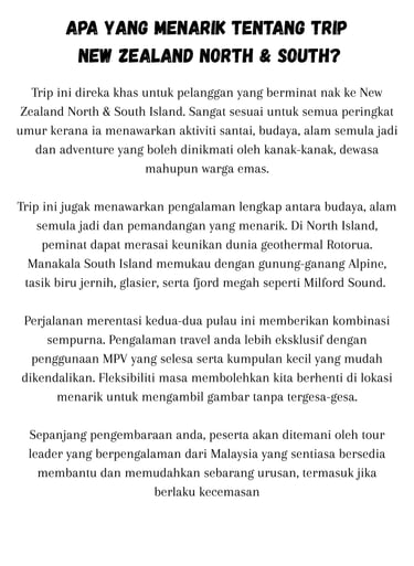 Trip New Zealand North & South memang mengagumkan! Semua tempat yang dibawa sangat cantik dan tersusun. Tour leader sangat membantu dan perjalanan sangat selesa. Sangat puas hati.