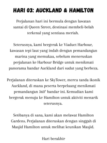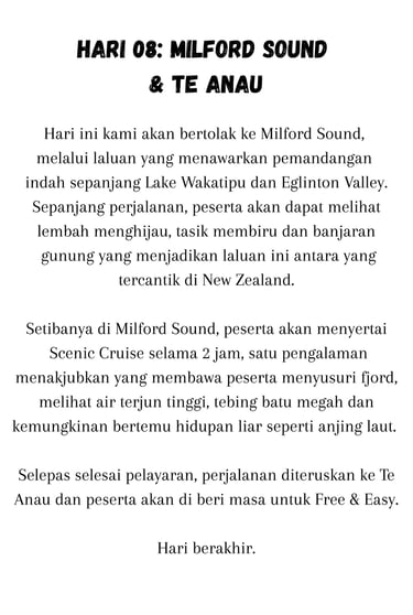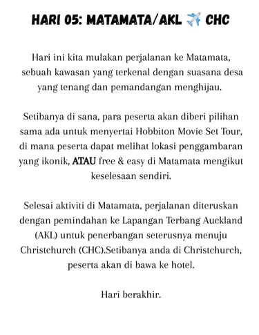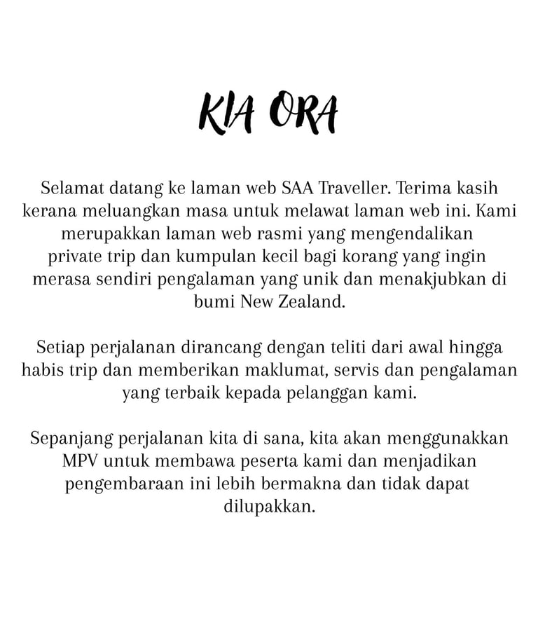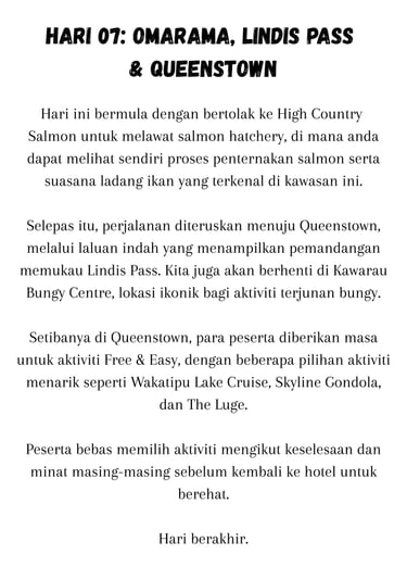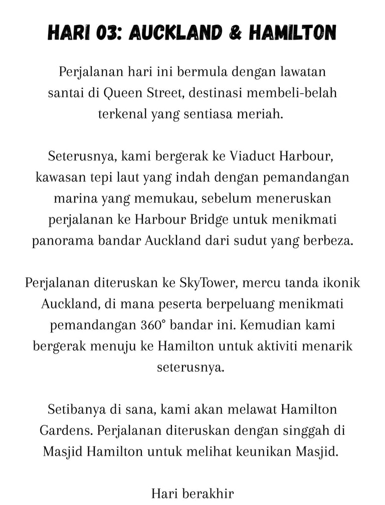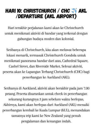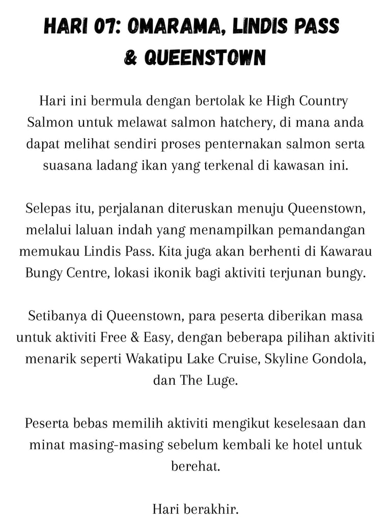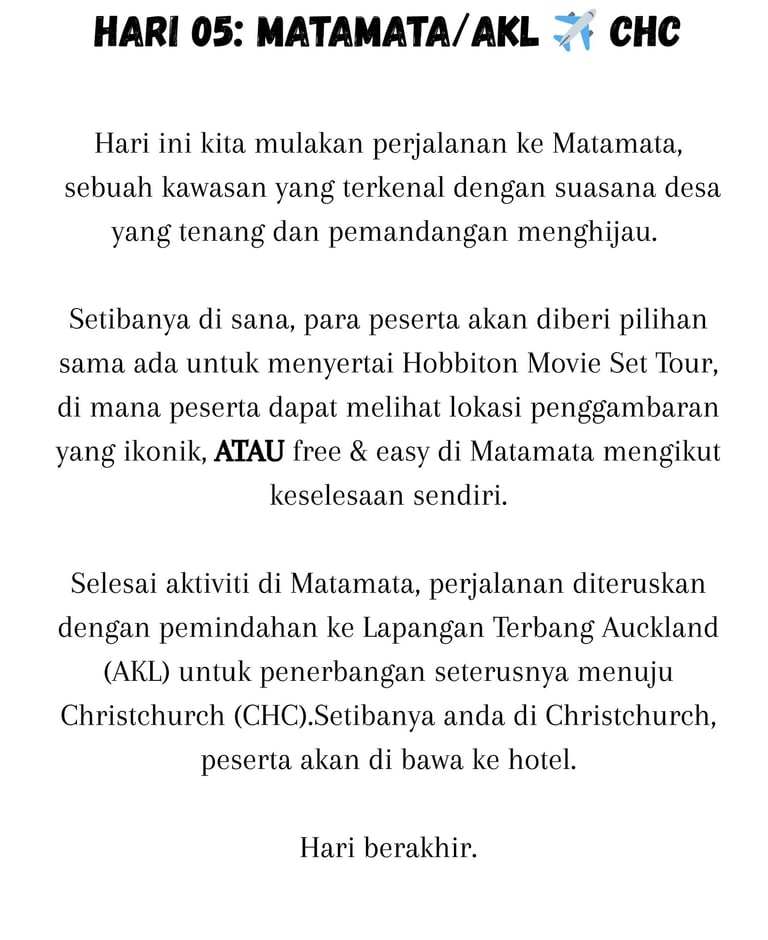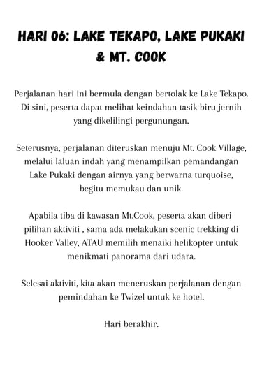 Trip New Zealand North & South memang mengagumkan! Semua tempat yang dibawa sangat cantik dan tersusun. Tour leader sangat membantu dan perjalanan sangat selesa. Sangat puas hati.