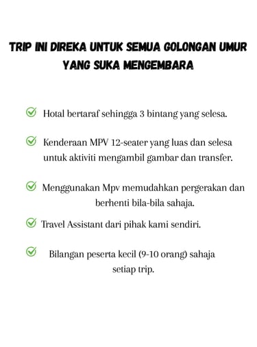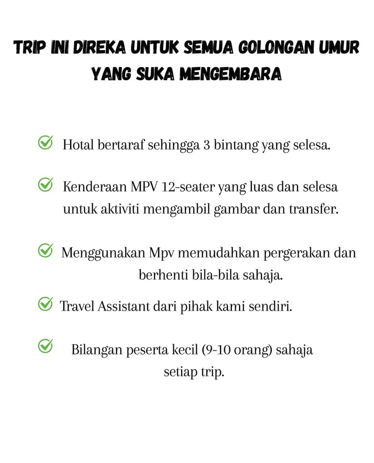 Kumpulan kecil, perjalanan selesa dengan MPV, Private & Customized, serta Pakej Perjalanan yang disesuaikan untuk setiap pengembara.